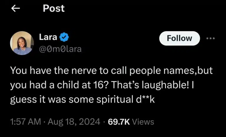 Hours later, a viewer, seemingly unhappy with this, took to her social media page to criticize Ruthee, saying: “You have the nerve to call people names, but you had a child at 16? That’s laughable! I guess it was some spiritual d**k.”
