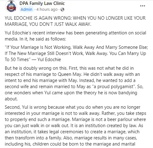“YUL EDOCHIE IS AGAIN WRONG: WHEN YOU NO LONGER LIKE YOUR MARRIAGE, YOU DON’T JUST WALK AWAY.