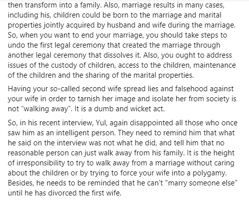 So, in his recent interview, Yul, again disappointed all those who once saw him as an intelligent person. They need to remind him that what he said on the interview was not what he did, and tell him that no reasonable person can just walk away from his family. It is the height of irresponsibility to try to walk away from a marriage without caring about the children or by trying to force your wife into a polygamy. Besides, he needs to be reminded that he can’t “marry someone else” until he has divorced the first wife.”