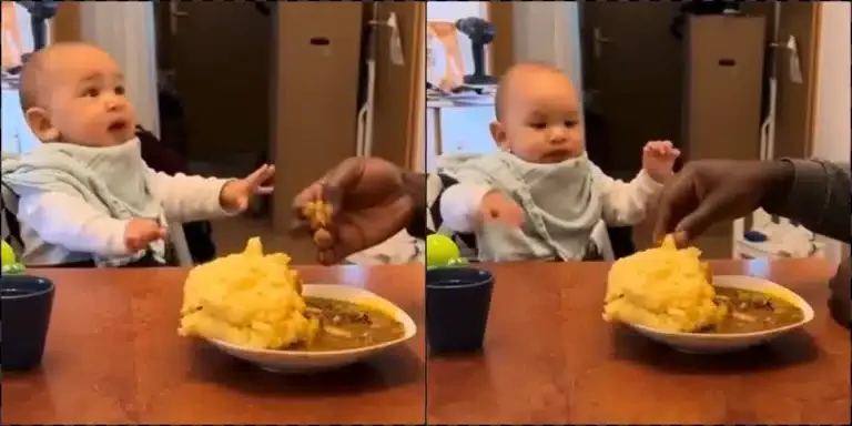 A mixed-race baby ditches processed food as he eagerly shows interest in the Nigerian meal known as Eba with draw soup.