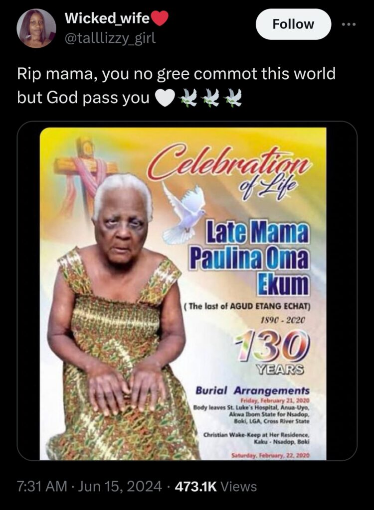 Nigerian Lady Breaks Internet with Unique Tribute as 130-year-old Grandmother Passes On