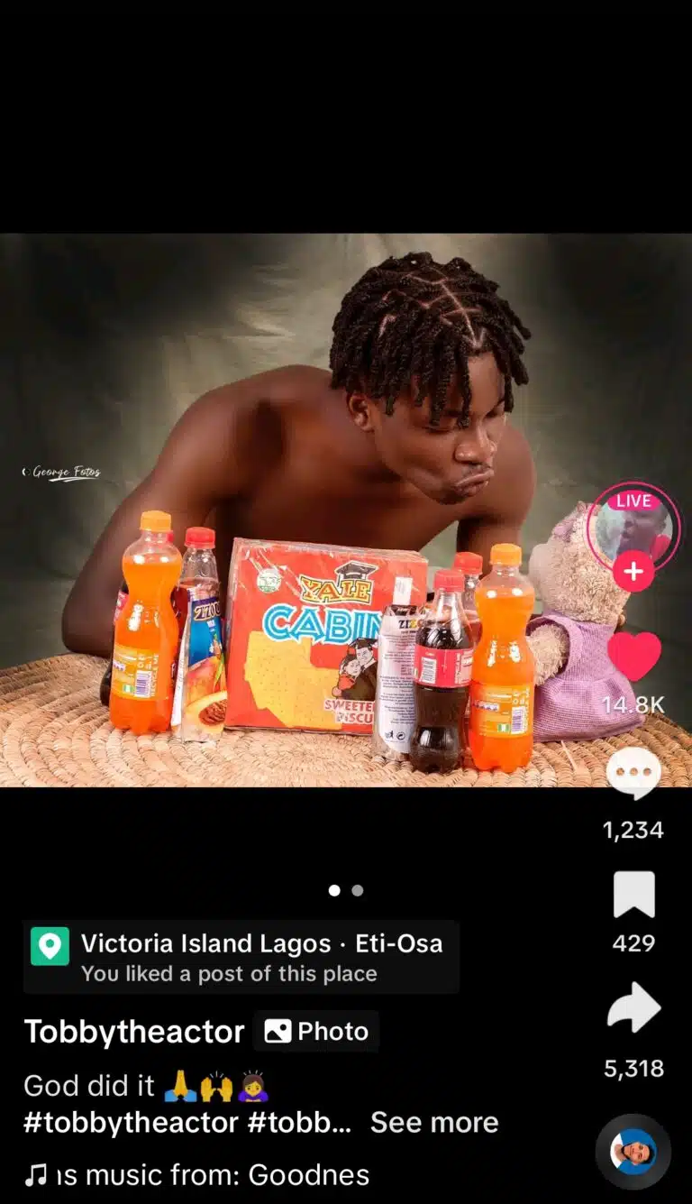 In the post, the man shared photos from a photoshoot where he posed alongside a pack of cabin biscuits, Coke, Fanta, and several other items clearly visible on the table.