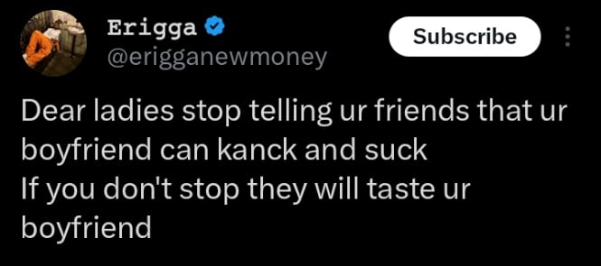 In his words: “Dear ladies stop telling ur friends that ur boyfriend can knack and suck. If you don’t stop they will taste ur boyfriend.”