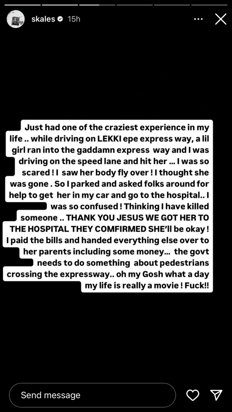Skales disclosed how scared he was after seeing the girl’s body flip into the air and thought she died. He disclosed how he rushed her to the hospital for immediate treatment.