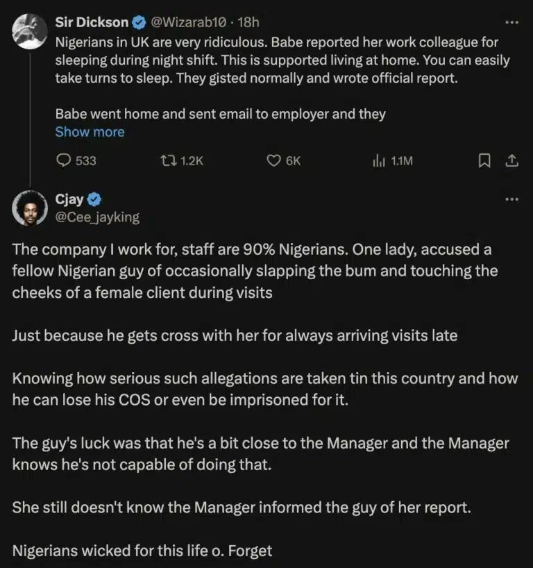 “Nigerians in UK are very ridiculous. Babe reported her work colleague for sleeping during night shift. This is supported living at home. You can easily take turns to sleep. They gisted normally and wrote official report. Babe went home and sent email to employer and they dismissed the guy,” he wrote.